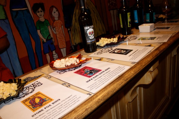 Next we decided to taste the 6 wines they were pouring, each paired with a locally made cheese. One thing you notice immediately about Chronic Cellars wines are the fantastic wine labels and clever wine names. The bright-colored labels are drawn by Joe Kalionzes, an amazing artist and good friend of the owners.