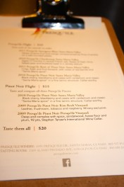 While the dogs played, we sat at the bar and started our tasting. They offer a Presqu’ile Flight for $10 which includes a Sauvignon Blanc, a Chardonnay, a Rose and a Pinot Noir. They also offer a tasting flight of 3 Pinot Noirs for $15, or you can taste all 6 wines for $20.