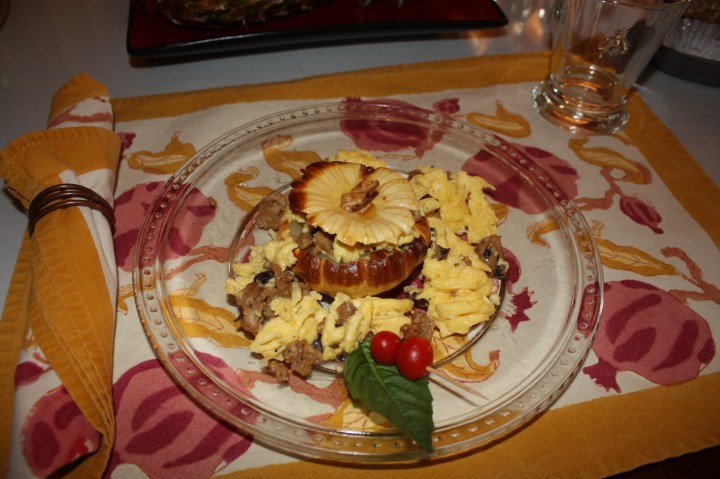 Amazing breakfast #1: Egg & sausage scramble with fresh mixed fruit, fresh squeezed juice, and warm muffin