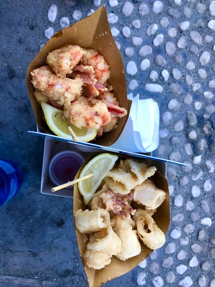 We lingered on the patio at Buranco for as long as possible before buying a delicious bottle of Syrah/Cabernet Sauvignon and heading back to town.  Rather than subjecting ourselves to another 9 mile hike, we decided to grab the train back to Levanto, but not before sampling some of the yummiest, freshest fried shrimp and calamari I’d ever had at Il Bocconcino.